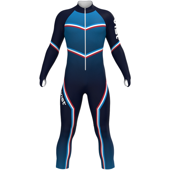 Combinaison de ski de course avec tissu élastique, respirant et coupe-vent.